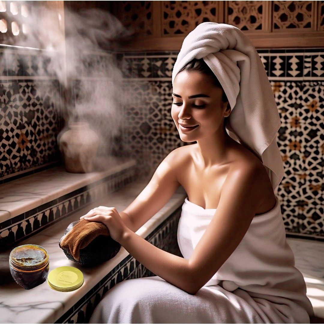 Le savon noir, un exfoliant traditionnel du Hammam, pour une peau soyeuse et satinée. Fabriqué artisanalement au Maroc et composé d’éléments naturels pour conserver sa richesse.